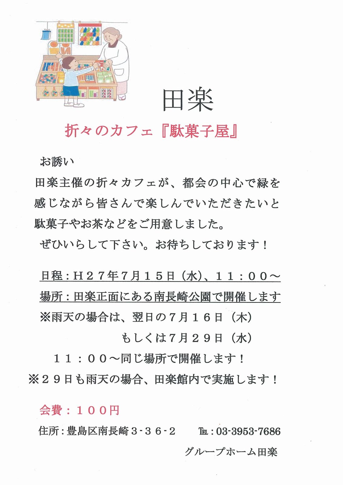 7月15日(水)11時〜折々のカフェ「駄菓子屋」東京都豊島区南長崎公園 グループホーム田楽